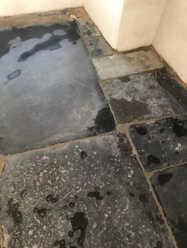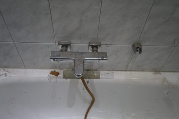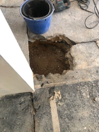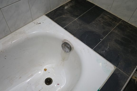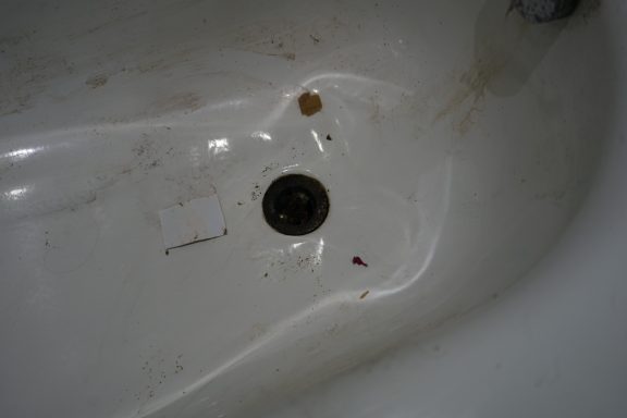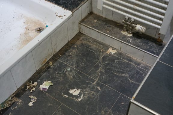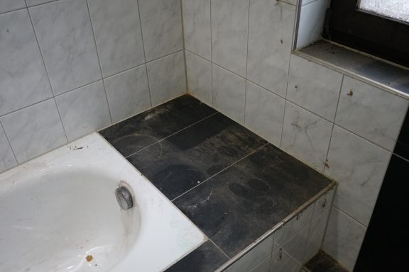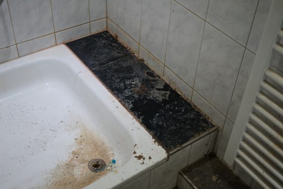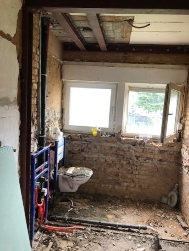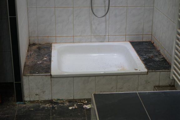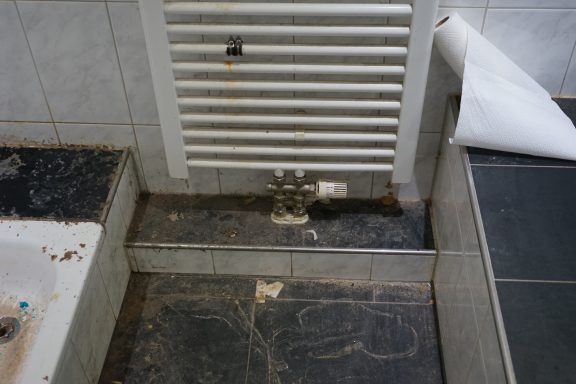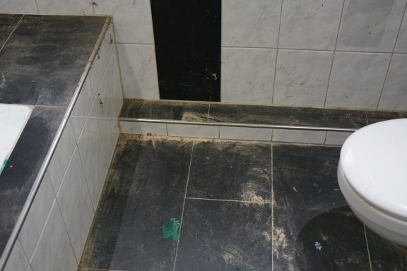 Nach einer kompletten Sanierung des Badezimmers stellte der Eigentümer fest, das weder im sanierten Badezimmer, noch im angrenzenden Gäste-WC, weder aus den Toiletten, noch aus den Waschbecken, das Wasser und Fäkalien abliefen. Alles staute sich auf und lief über. Grund dafür Fließestrich, der in die Abwasserrohre gelangte und dort aushärtete.